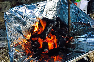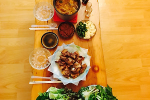 야채를 먹기 위해 , 삼겹살을 구웠다.